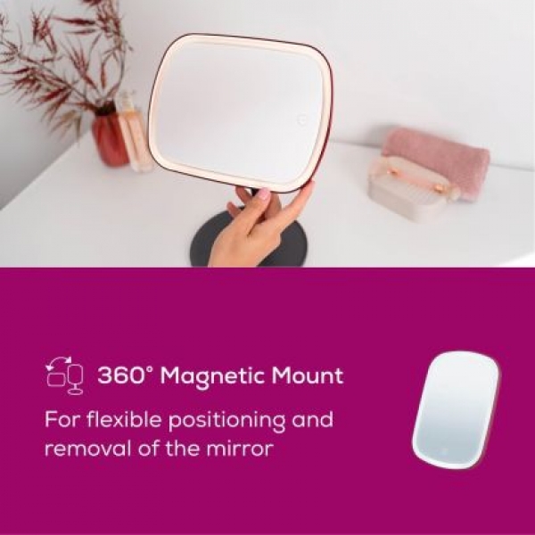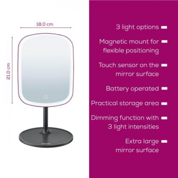 Automatic switch off after 15 minutes; Magnetic bracket for flexibility when positioning and removing the mirror; Easy to use thanks to touch-sensor on the mirror surface