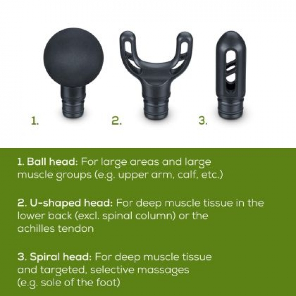 Activation and regeneration through targeted muscle massage; Quiet - only 46 dB at level 1; 3 high-quality massage attachments for personalised usage; Powerful lithium-ion battery with up to 4 hours of battery life