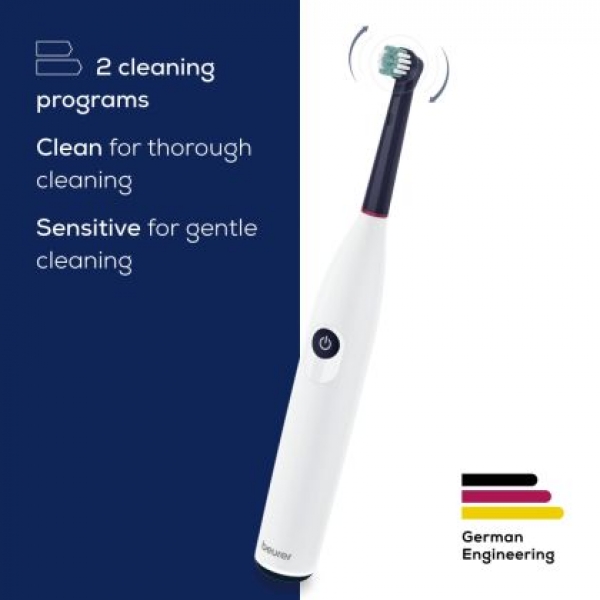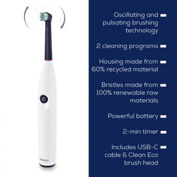Електрическа четка за зъби Beurer TB 15 Electric toothbrush; 2 cleaning programs; 12days Battery life; 2-min timer; Oscillating, pulsating, brushing technology; Incl. USB-C charging cable and Clean Eco brush head; white