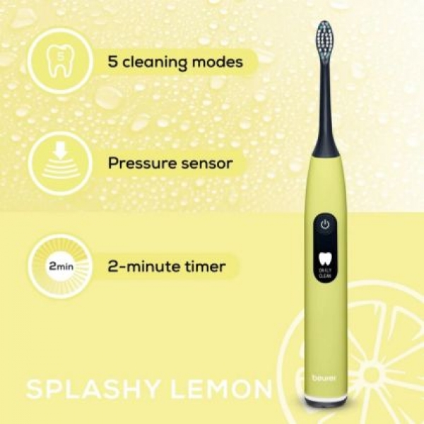 Електрическа четка за зъби Beurer SC 50 splashy lemon Electric Sonic Toothbrush, up to 80,000 mov/min, 5 cleaning programs: Clean, Sensitive, Polish, Gum Care, Whiten, Pressure sensor , 2-min. timer, Incl. 2 toothbrush heads and magnetic charging plate, 2