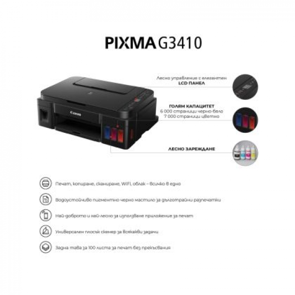 Мастилоструйно многофункционално устройство Canon PIXMA G3410 All-In-One, Black