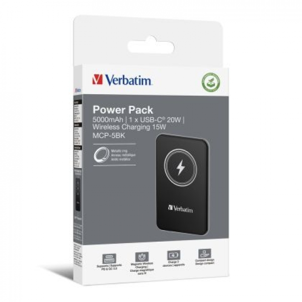 Външна батерия Verbatim MCP-5BK Power Pack 5000 mAh with UBS-C PD 20W / Magnetic Wireless Charging 15W Black