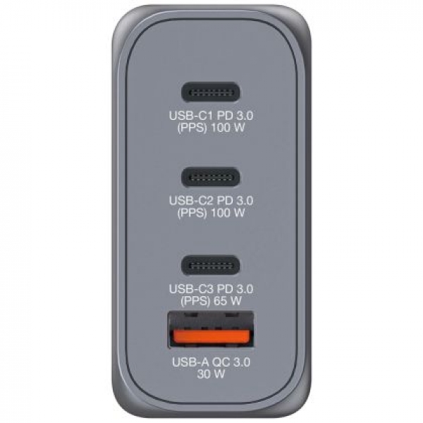 | Мощност, W | Total Output: 100W max, USB-C 1/2 (PPS) Output: Max PD 100W (when used alone) PPS mode Max 45W, USB-C 3 (PPS) Output: Max PD 65W (when used alone) PPS mode Max 45W, USB-A QC 3.0 Output: Max 30W (when used alone) |
