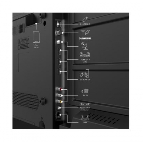 3 HDMI, 2 USB, CI+, AV IN, SPDIF optical, HEVC/H.265