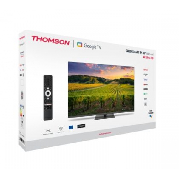 Телевизор Thomson Smart QLED TV 43"; Google TV; 3840 x 2160 (4K UHD), 4000:1, QLED, 60 Hz, DVB-T/T2/C/S/S2, HDR10, Hotel mode, Wi-Fi, Bluetooth, LAN, HDMI 2 (2.0) + 2 (2.1), USB 2 (2.0) + 1 (3.0), Central Swivel Stand, Dark gray