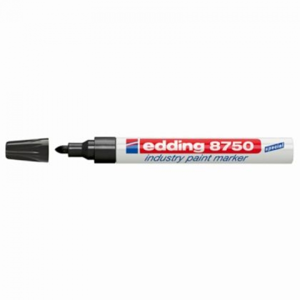 • За леко омаслени повърхности - индустриален маркер с боя edding 8750 • Идеален за маркиране с голяма покривност върху леко омаслени, прашни и тъмни повърхности • Устойчив на атмосферни условия и вода, светлина и морска вода • Температура: Диапазон на маркиране до 100 °C • Устойчивост на маркировката до 300 °C • Устойчивост на разтворители: изопропанол, етанол, масло / моторно масло (с изключение на цвят 049)