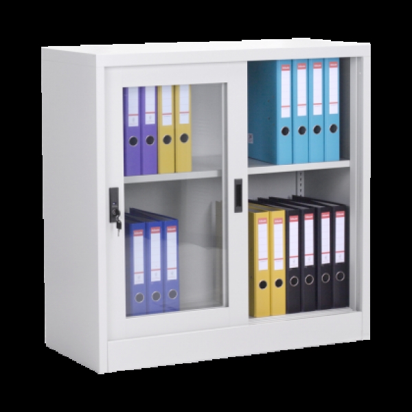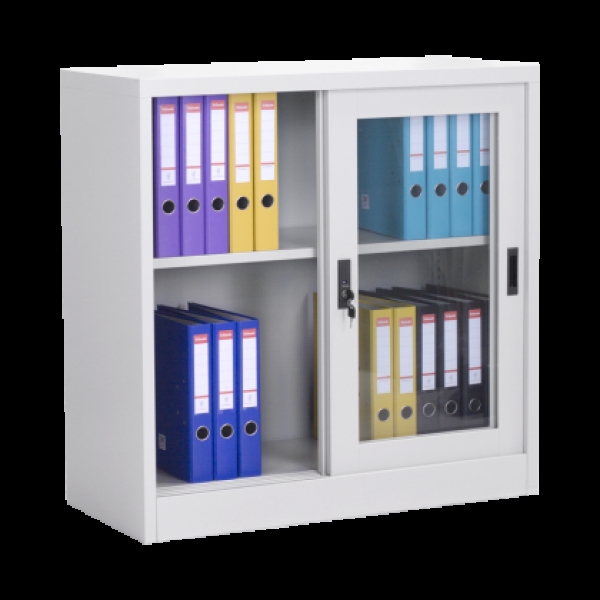 Метален шкаф CR-1264 J от серията метални шкафове на Carmen разполага с две плъзгащи метални врати със стъкло и рафт с регулируема височина. Системата от метални мебели на Carmen включва офис контейнери, метални гардероби за съблекалня, метални контейнери, метални шкафове за документи, кардекс и дру... →