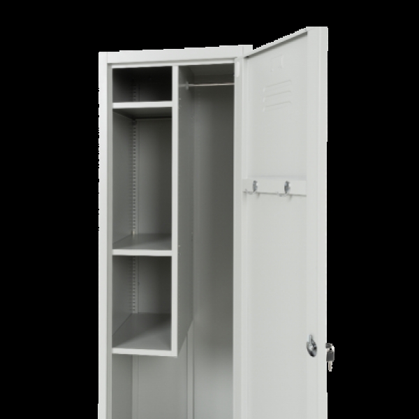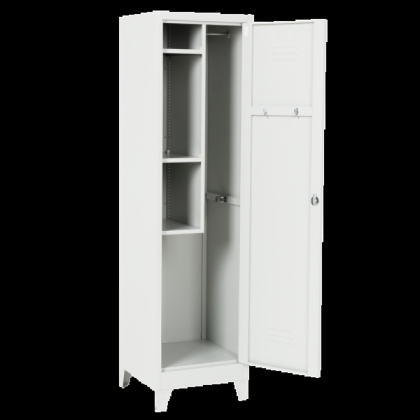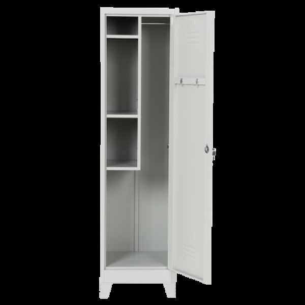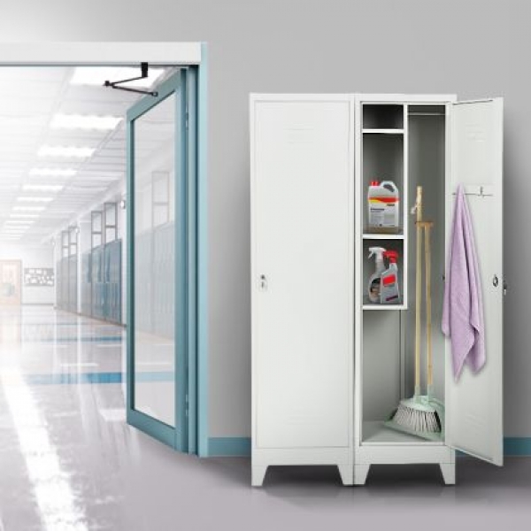Металният санитарен шкаф Carmen CR-1284 E J е универсално решение за съхранение, подходящо за офиси, съблекални и санитарни помещения. Изработен от праховобоядисан метал със светлосиво покритие, той предлага три здрави рафта с товароносимост до 40 кг, лост за закачалки и два кукички за допълнително удобство. Вентилационният отвор осигурява циркулация на въздух, а заключващата се врата гарантира сигурност. Пълна информация за размерите и характеристиките на модела ще намерите в таблицата в таб/поле "Техническа информация".