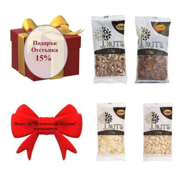 Пакет за “Класически козунак” - икономичен Пакетът включва: 1бр. Орех, сурова ядка, “Д-р Кескин”, 100гр – базова цена 3.25лв/бр. 1бр. Бадем филиран, сурова ядка, “Д-р Кескин”, 100гр или Бадем белен, сурова ядка, “Д-р Кескин”, 100гр – базова цена 3.99лв/бр. 1бр. Стафиди, сушено грозде, “Д-р Кескин”, ...
